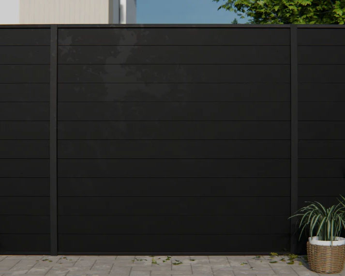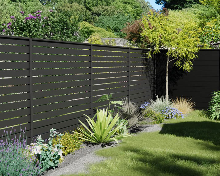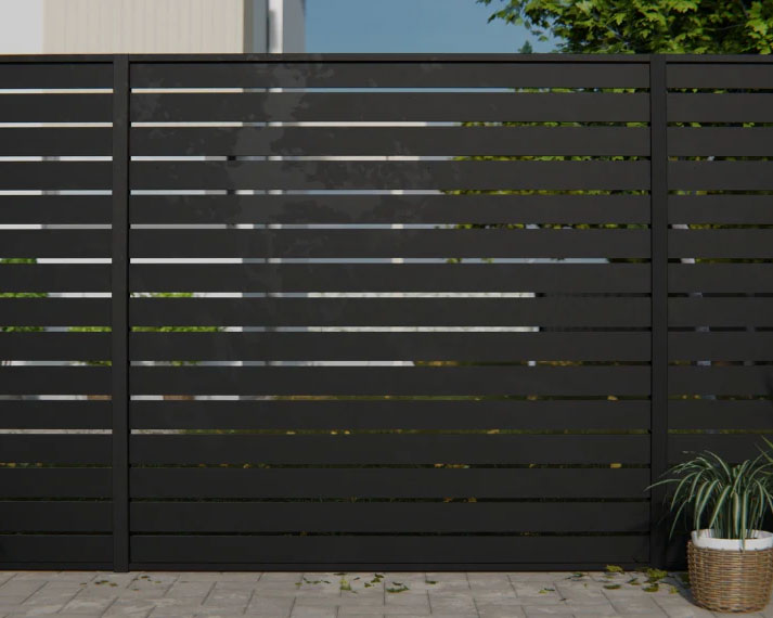 DuraPost Aluminium privacy panels are crafted from premium-grade 6063 T6 aluminium alloy and finished in a sleek satin black powder coating for a refined, durable result. These ready-made panels are designed to provide excellent privacy while maintaining a modern horizontal aesthetic, enhanced by subtle shadow gaps between each board.
