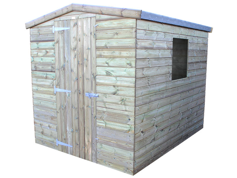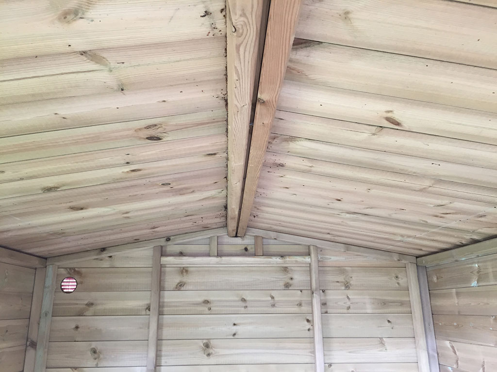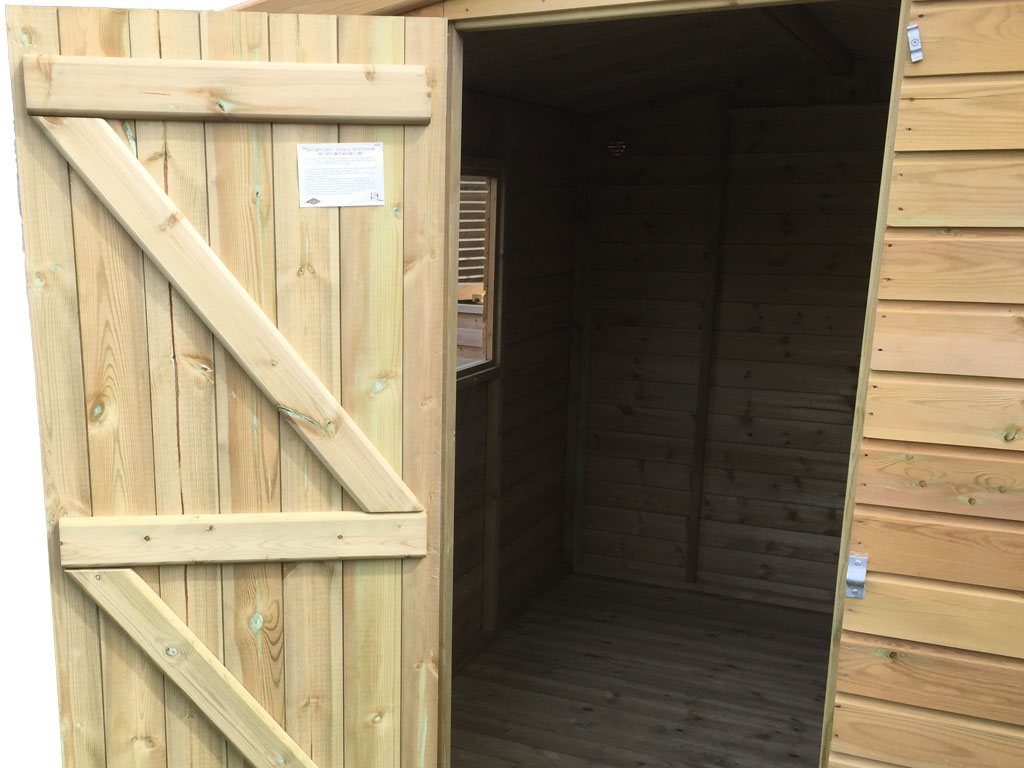 The highest quality construction includes; pressure treated Scandinavian Redwood timber for 25 years protection against wood decay and insect attack, 15mm ship lap cladding, 25mm x 125mm tongue and groove roof and floor, 7+ years life expectancy mineral roof felt, extra strong and rounded 35mm x 44mm framing, fixed toughened glass windows (s), 29” (74cm) left handed door with galvanised hinges, pad bolt, 2 turn buttons and stainless steel nails.