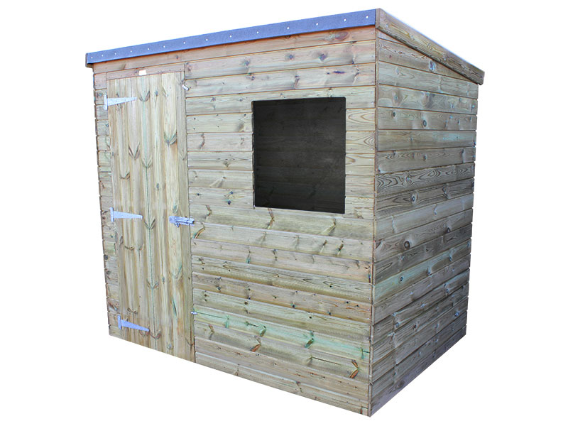 The highest quality construction includes; pressure treated Scandinavian Redwood timber for 25 years protection against wood decay and insect attack, 15mm ship lap cladding, 25mm x 125mm tongue and groove roof and floor, 7+ years life expectancy mineral roof felt, extra strong and rounded 35mm x 44mm framing, fixed toughened glass windows (s), 29” (74cm) left handed door with galvanised hinges, pad bolt, 2 turn buttons and stainless steel nails.